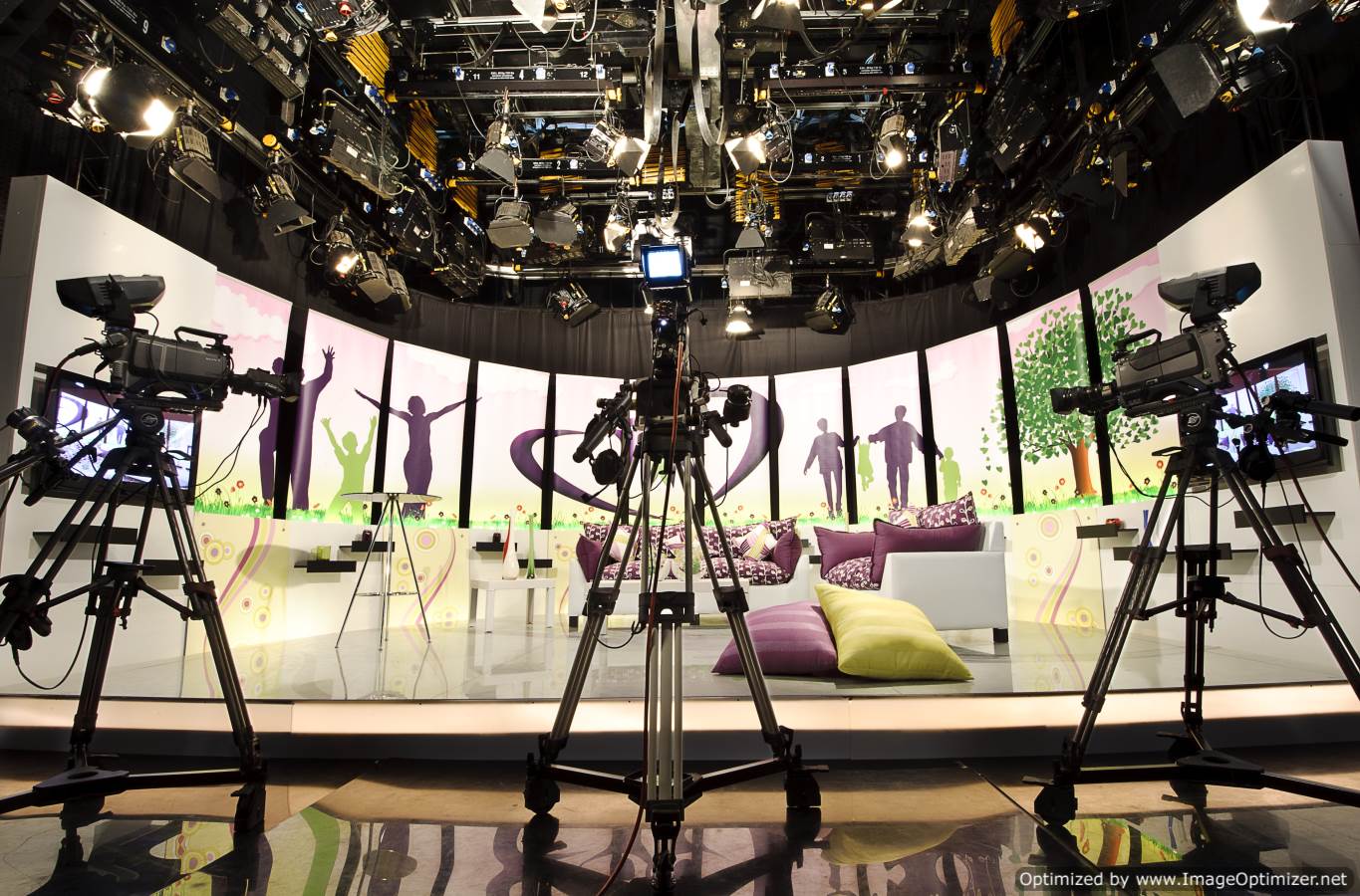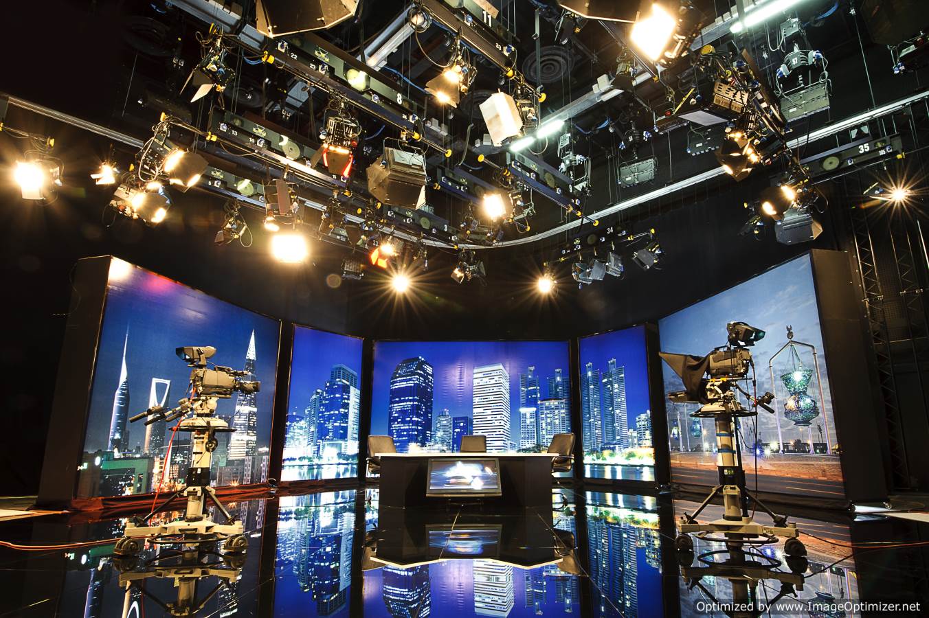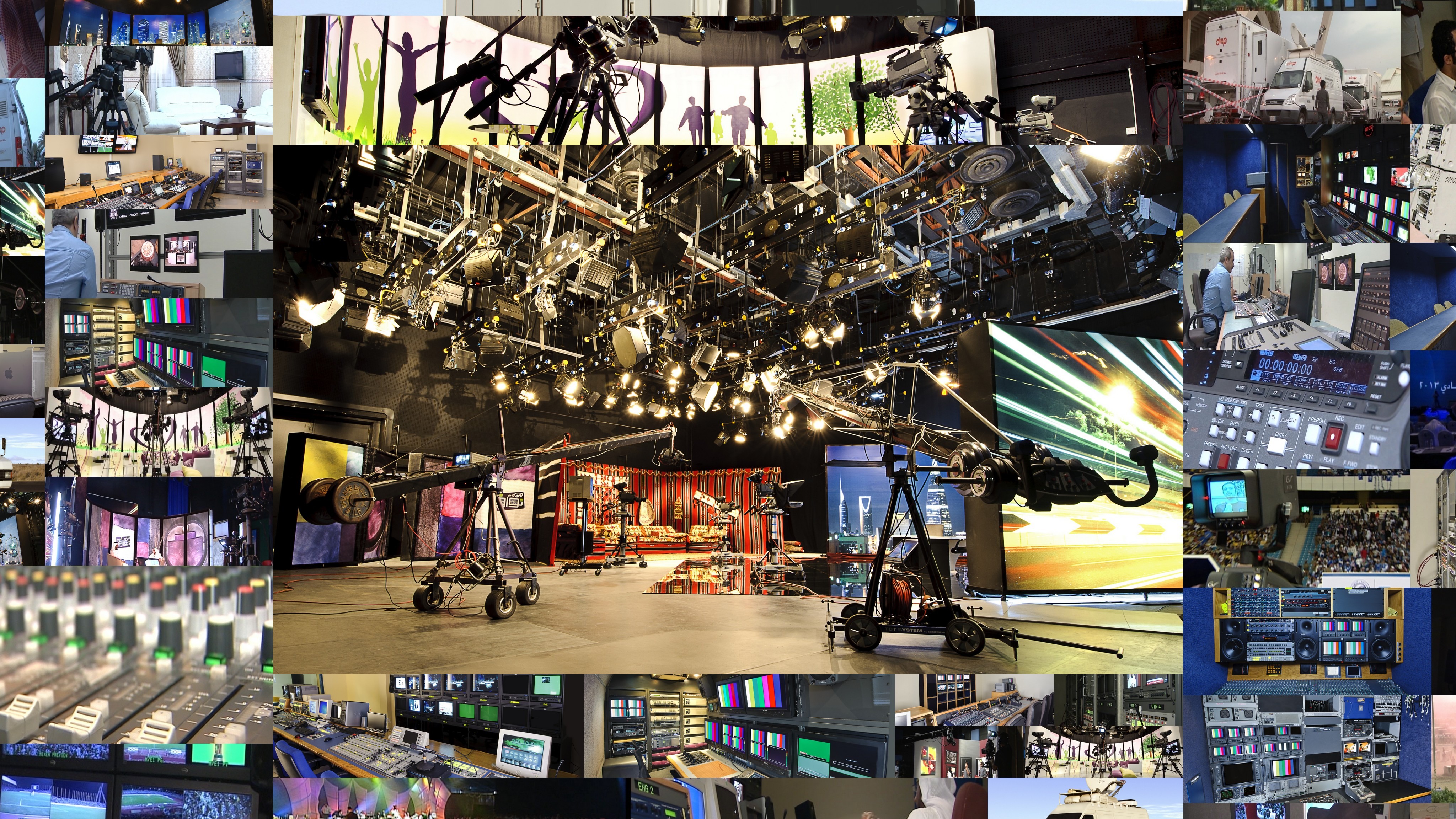 استوديوهات متكاملة بمختلف المساحات ( كبيرة ومتوسطة ) لتصوير وإنتاج البرامج الجماهيرية والحوارية والخاصة وغيرها ، بتقنية ( SD - HD ) ، أو تأجير هذه الاستوديوهات المجهزة ( كاميرات احترافية - شبكة إضاءات إلكترونية مختلفة تتناسب مع كل البرامج